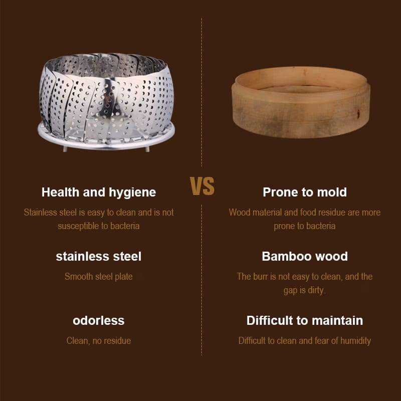 [EASY TO CLEAN AND STORE] The polished surface prevents food from sticking to the steamer, making it easier to clean and highly suitable for dishwashers. After use, clean the steamer and fold it to save storage space.