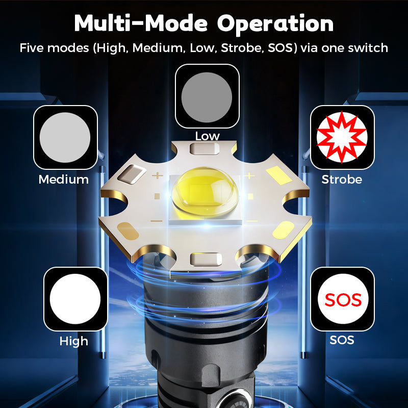 MULTI-MODE OPERATION - Features five distinct lighting modes (High, Medium, Low, Strobe, SOS) accessible via a single switch. This provides operational flexibility, allowing you to manage brightness, conserve battery, or signal for help.