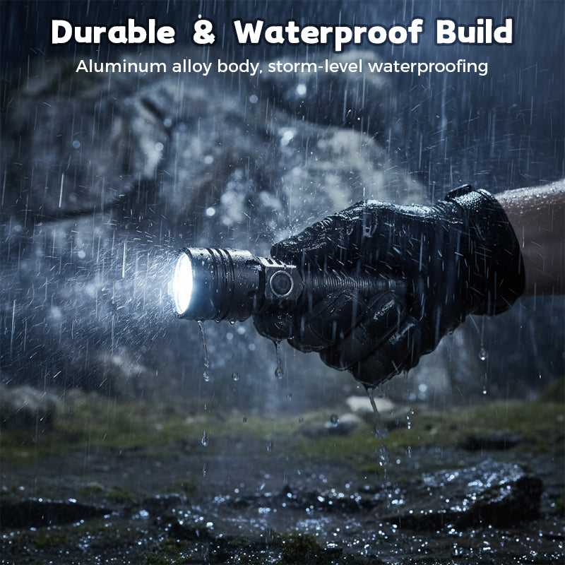 RUGGED ALUMINUM ALLOY CONSTRUCTION - Built from a high-strength aluminum alloy, this flashlight offers exceptional durability and resistance to impact and corrosion. Its sealed design ensures reliable performance even in heavy rain and harsh conditions.