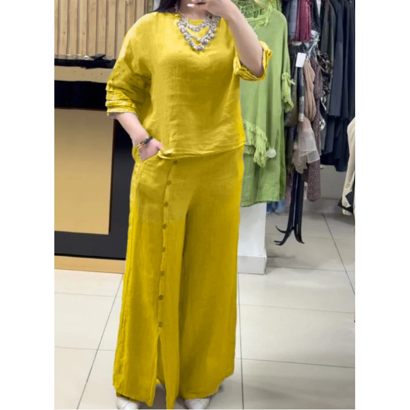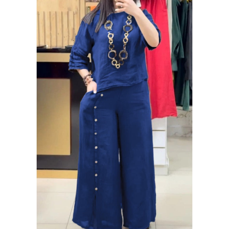 Women's Solid Color Casual 3/4 Sleeve Top Loose Button Pants 2-Piece Set